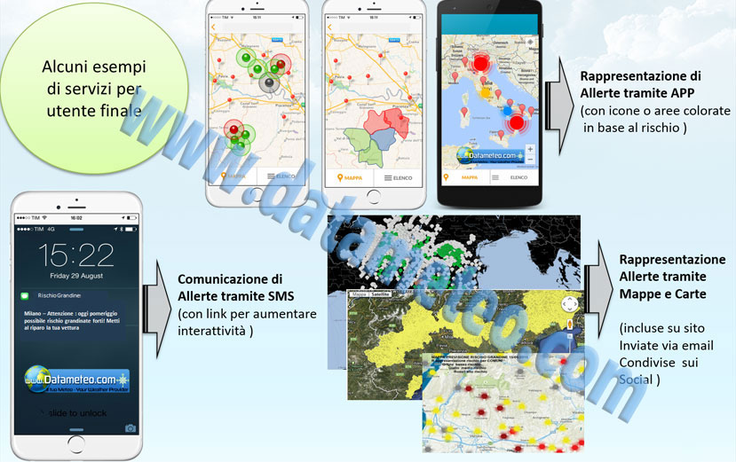 Scopo del servizio è validare manualmente la grande moltitudine di parametri provenienti dai modelli meteorologici in un'informazione semplice e mirata, pronta per essere utilizzata per finalità di protezione civile, decision making nei settori dell'energia, trasporti, assicurazioni.. ll sistema più immediato di divulgazione delle informazioni rimane il breve messaggio di testo sms mentre una completa piattaforma multimediale basata sulla tecnologia GIS MeteoBrowser di gestione e monitoraggio via internet offre informazioni meteorologiche a valore aggiunto oltre che di monitoraggio del sms inviati.