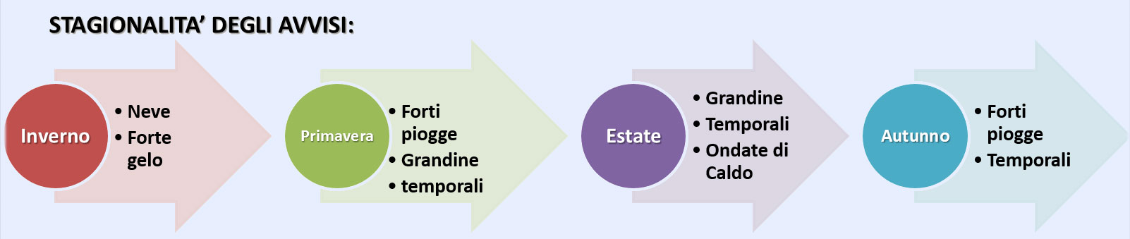 Le classi di allerta gialla fenomeni significativi, arancione fenomeni intensi , rossa fenomeni molto intensi in cui è suddiviso il servizio rispecchiano il grado di criticità dal più basso più elevato, dei principali parametri di allerta quali:(vento, precipitazioni, temperatura).